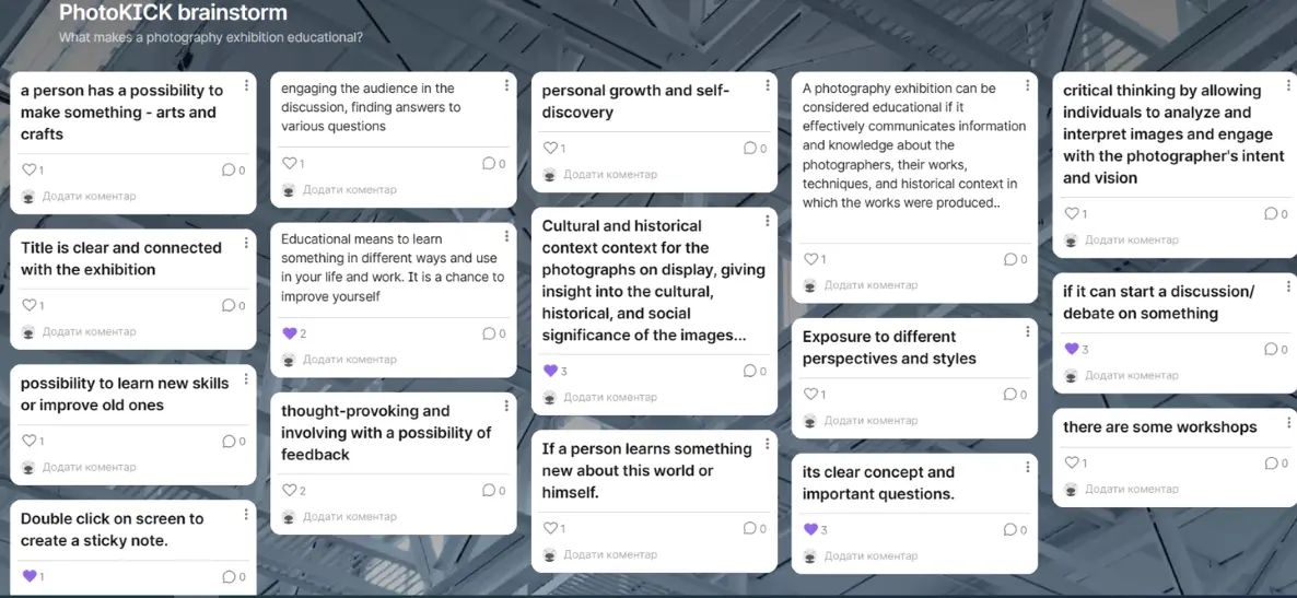 After that, all participants of the project took part in a brainstorm on the Padlet platform and discussed what makes a photography exhibition educational. Another activity was a group discussion the project’s target audiences – andragogues and adult learners. The first group discussed what great characteristics a great andragogue or adult learning specialists must have when they are creating an educational photography exhibition and what challenges do they experience creating a non-formal education for adults. The second group shared their experience working with adults and presented their views on adult learners expectations, challenges and if non-formal adult education is different from other target groups.